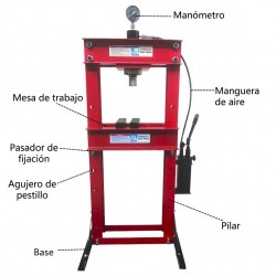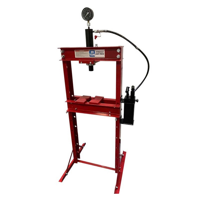 Prensa Hidráulica de Taller de 20 Toneladas, diseñada para trabajos pesados de montaje, desmontaje, enderezado y doblado de piezas metálicas. Es un equipo esencial para cualquier taller mecánico o industrial que maneje rodamientos, bujes y juntas.
