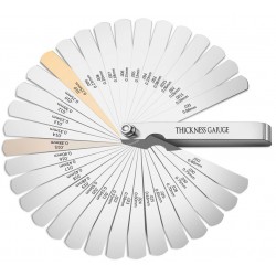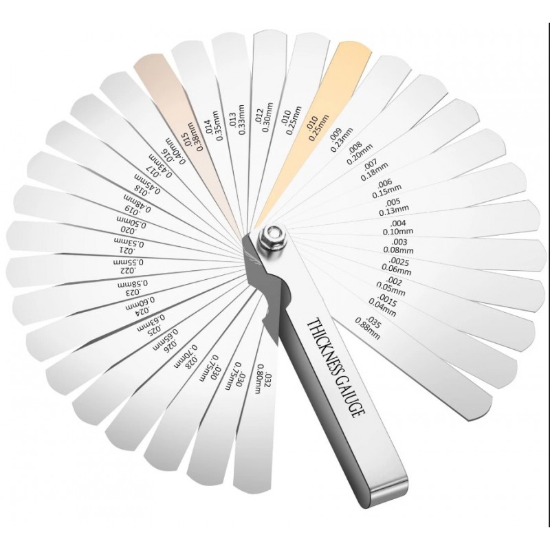 Calibrador de Láminas (Galgas) de 32 Hojas. Fabricado en acero de aleación endurecido, este juego de alta precisión permite medir huelgos de válvulas, separación de electrodos en bujías y tolerancias críticas con total exactitud. Incluye 32 espesores distintos con marcas grabadas en sistema métrico (0.04 - 0.88 mm) y pulgadas (0.0015" - 0.035"). Su diseño plegable con tuerca de bloqueo asegura un manejo cómodo y protege las láminas contra dobleces. ¡La herramienta de medición clásica e indispensable para todo especialista en motores!