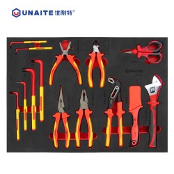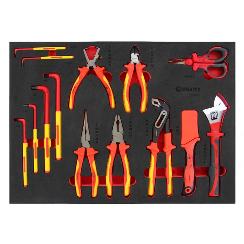 Bandeja con juegos de herramientas consistente en 14 pzas de alicates llaves ajustable y allen con aislamineto electrico