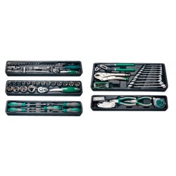 Bandeja 2: Llave T deslizante 1/2", junta universal de 1/2", extensoin de 4" de 1/2", chicharra 1/4", mango 1/4" extension 2" 1/4", Dados 1/4" cortos hexagonales: 4,4.5, 5, 5.5, 6, 7, 8, 9, 10, 11, 12, 13mm