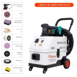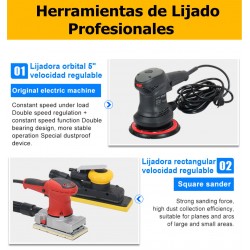 Incluye un lijador orbital electrico profesional de 6", aspirador de polvo , juego de lijas y otros accesorios.